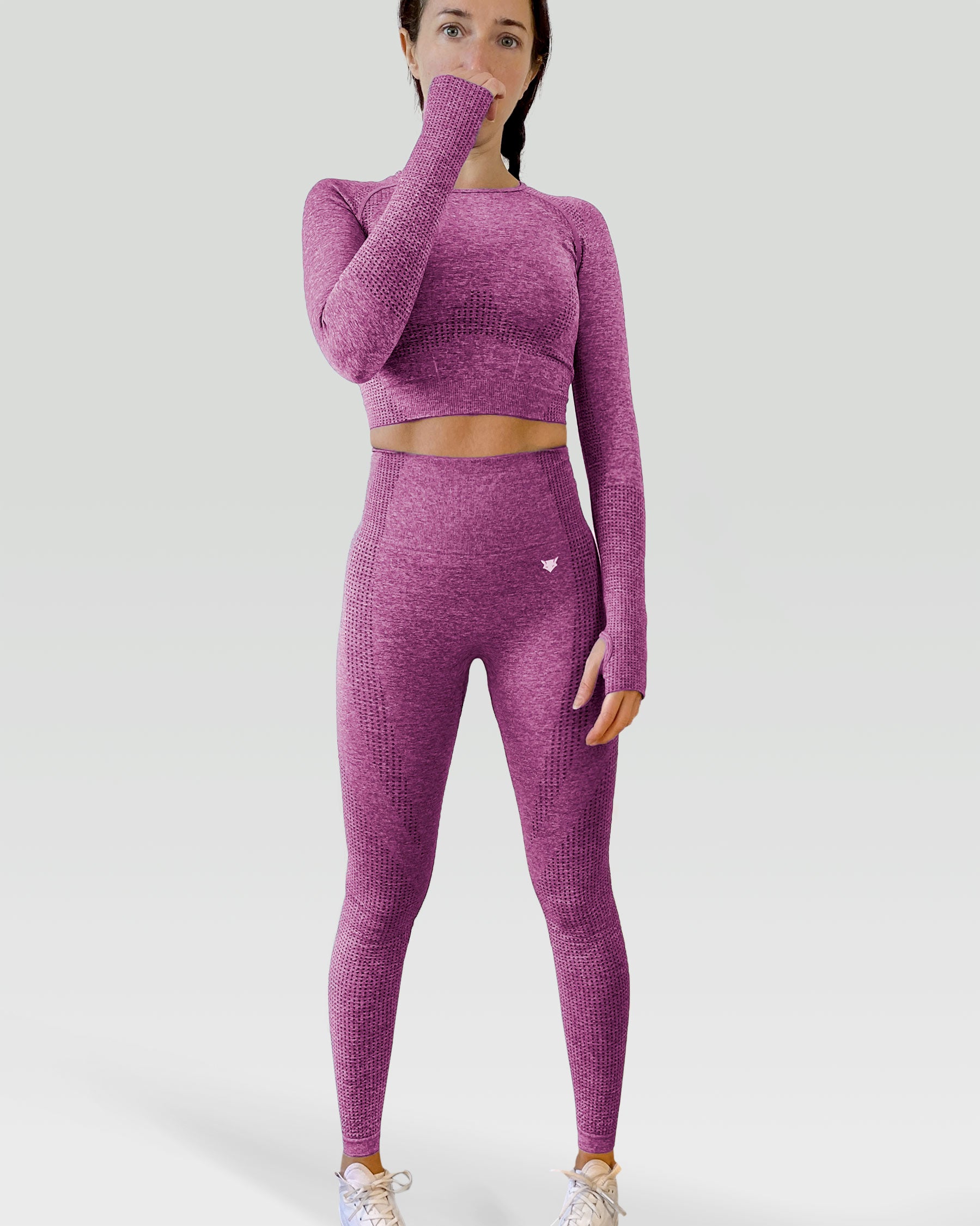 Show Your Style in the Elite Seamless 3-Piece Set, featuring Leggings, Sports Bra, and Long Sleeve Crop Top in Purple